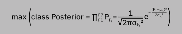 For us to classify the new observation, we calculate the posterior value for each feature in the feature vector and take the product of those values. The class with the highest posterior product (maximum a posteriori) is the class we select: max (class Posterior = ∏F⁷F1 PFᵢ = 1 / (√2πσFᵢ²) * e^ [– (Fᵢ–μFᵢ)² / 2σFᵢ²]