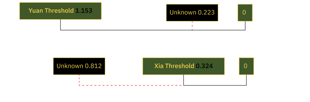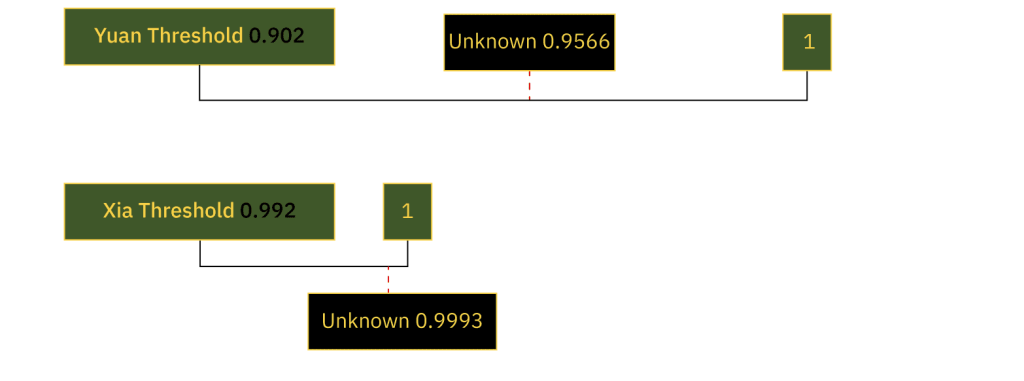 Thus, we can see that our Euclidean distance classifier shows the Yuan class to be closer to the UNKNOWN class than the Xia.
