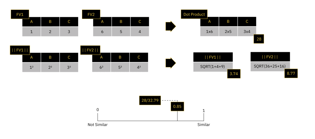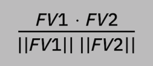 The cosine of two feature vectors can be derived by using the Euclidean dot product formula. This can be simply stated as the sum of the products of the individual values of the feature vectors (dot product) divided by the product of the magnitudes of each feature vector. We can write this in vector form as: (FV1 * FV2) / (||FV1|| ||FV2||)