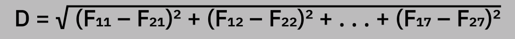 Euclidean distance is a metric classifier because it uses the Euclidean distance as the measure of difference between two feature vectors. In our REDSUB example, we have a feature vector of seven dimensions, so our distance formula is: D = √ (F₁₁ – F₂₁)² + (F₁₂ – F₂₂)² + . . . + (F₁₇ – F₂₇)²