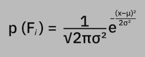 A probability density function (PDF) is used to define the random variable’s probability of being within a distinct range of values, as opposed to taking on any one value: p (Fᵢ) = 1 / (√2πσ²) * e^ [– (x–μ)² / 2σ²]
